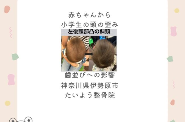 神奈川県伊勢原市のたいよう整骨院では赤ちゃんから小学生の斜頭、絶壁、短頭症、頭の歪み、向きグセ、成長発達の遅延、便秘、皮膚のトラブル、ベビー整体などをしています。