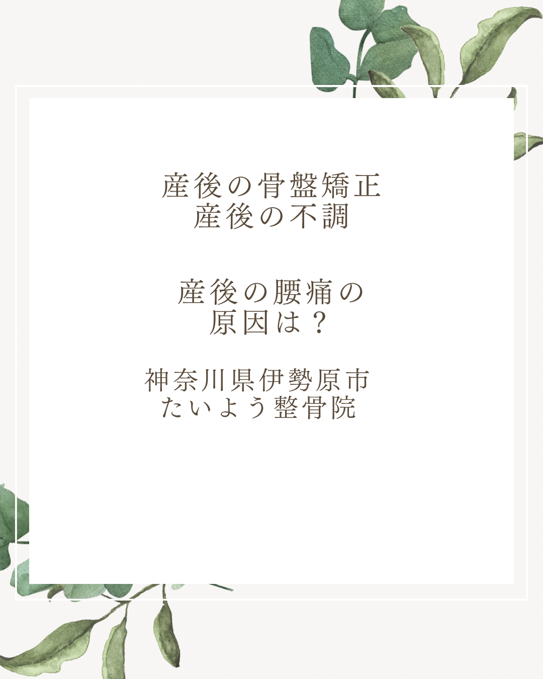当院は、伊勢原市のたいよう整骨院 で、産後の骨盤矯正と産後特有の不調を専門的に手技療法で行っています。